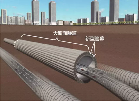 一般的管幕法是利用专用的管幕顶管机,通过管道之间的锁定连接形成封闭或半封闭的管幕,然后在管幕围护下实现地下空间的非开挖施工。这种新的“管幕施工法”与传统的管幕施工法略有不同,它采用小截面圆形盾构机,将多个小截面组合成一个圆形念珠状的管幕结构,待全部完成后,将内部的土和沙开挖出来,从而构建出一个大的地下空间。
