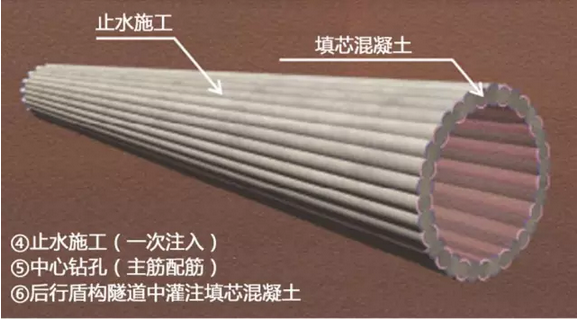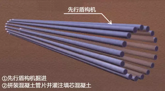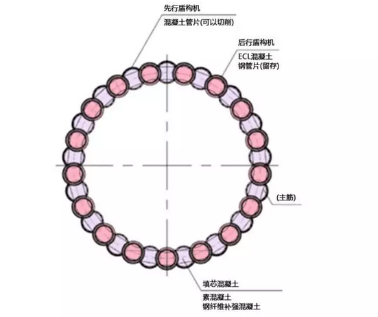 第一台盾构机采用混凝土管片拼装,然后向第一个盾构隧道内灌注填芯混凝土;第一条盾构隧道填筑完成后,后盾构机开始挖切第一条盾构隧道的一部分,两个隧道通过钢管拼装后直接浇筑ECL混凝土(挤压混凝土衬砌)连接。最后,在后盾构隧道内灌注填芯混凝土,形成圆管帷幕结构。