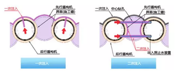 止水施工通过隧道内注浆(一次注浆)完成,在盾构机中心钻孔时确认止水性能。如有必要,可通过二次注入来保证界面的止水性能。